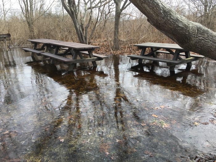 Picnic tables on ice. Spring is still a distant concept here in Maine 🙂