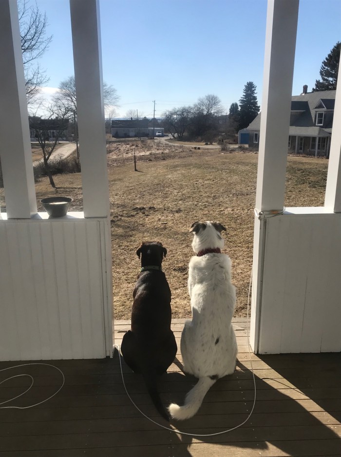 Here are the two pups on the property being kind to each other in a quiet moment of reflection. The wrestling started right after 🙂 Photo by Shirley Maxwell. Thanks, Shirley!