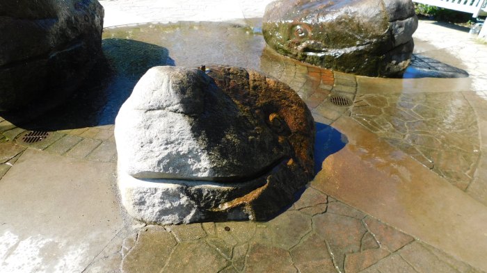 I’ll leave you today with a couple of whale rocks from the Botanical Gardens in Boothbay, ME. These whales emerge from the concrete and spout periodically as you pass by. Joy 🙂
