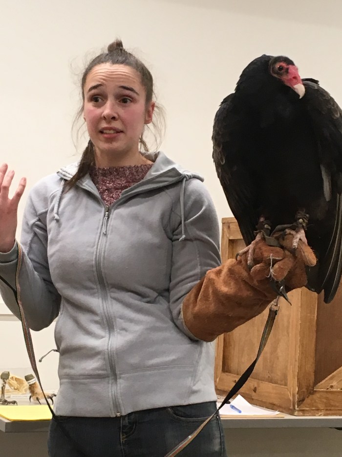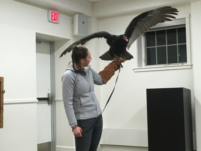 Last night my work included a visit from The Center for Wildlife. This is Kristen with Violet, the Turkey Vulture. Both were excellent guests!