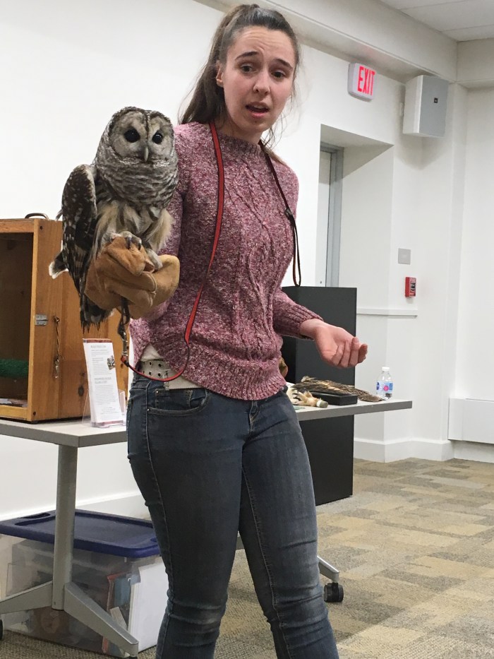 Here was our “guest” at the library last week – Byron the Barred Owl with Kristen, his handler. Byron got hit by a car and is not releasable. He “works” at The Center for Wildlife now as a nanny to baby owlets.