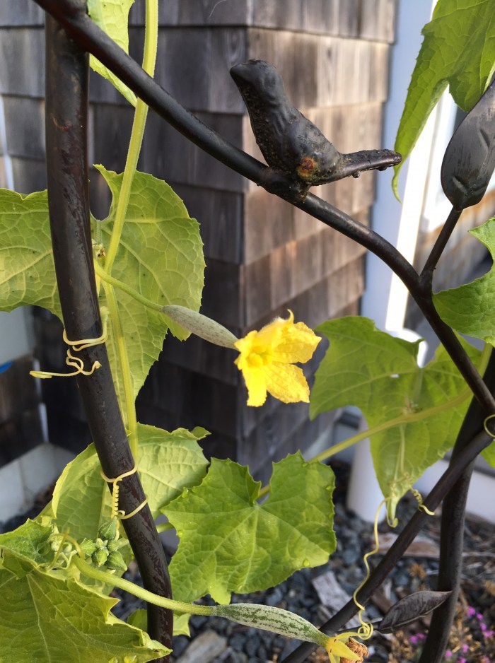 Last spring, I decided to grow luffa sponges (which are in the gourd family). Luffas take about 180 days to get from seed to full-sized luffa. I have a growing season of about 90 days here in Maine. Here’s where they are right now. I’m going to have some very, very tiny sponges come the first October frost but it was still great fun seeing these come up and flower! 🙂